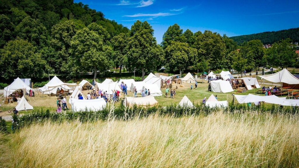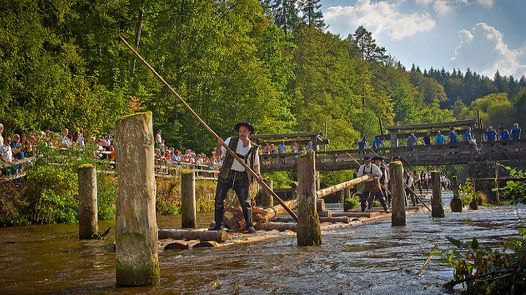 Highlight ist alle zwei Jahre das Flößerfest. Wenn du um 11 Uhr ein kräftiges „Jockele sperr“ hörst, dann warten Flößer und Holzberufler auf den Beginn der Floßfahrt. Dann öffnet sich nämlich die Stauwehr „Monhardter Wasserstube“ und die Flößer rauschen mit ihrem Floß auf der Flutwelle die Nagold hinunter – ein Spektakel für Klein und Groß!