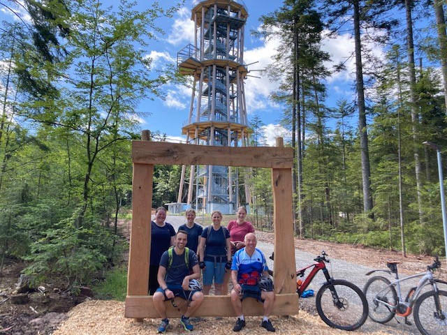 Wir fahren weiter die Höhe nach Schömberg hinauf. Zwei Stopps mit gekühlten Bieren und Anti-Alkoholischem erfreuen uns immer wieder. Mit Anlauf und einer Extrarunde zum Schwungholen geht es Pfade hinauf und mitten durch blühende Wiesen. Auf der Höhe kommt nun auch die Sonne raus – hier ist die Welt noch in Ordnung! Der Aussichtsturm Himmelsglück Schömberg ist unser nächstes Ziel. Auch dorthin geht es über Waldboden und Wurzeln, die den Fahrradkorb ordentlich zum Scheppern bringen. Wir schießen Erinnerungsfotos bevor es für uns durch den Ort weitergeht. Hier trennen wir uns – die Furchtlosen fahren den Schlittenhang hinunter während wir anderen die tolle Abfahrt in den Wald nehmen! Wir treffen uns, alle heil und gesund, wieder und können es nun kilometerweit bis nach Unterreichenbach rollen lassen. Der Fahrtwind bläst uns um die Ohren, der Schotter knirscht unter den Rädern – wieso kann man eigentlich nicht immer nur runterfahren?!