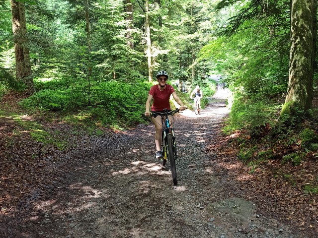 Über den Nagoldtalradweg fahren wir zum Monbachtal. Die Zügel werden wieder angezogen und es geht bergauf. Am Zeltplatz kreuzen wir die Schlucht und haben einige Mühe den aufgeweichten Boden zu bewältigen. Wer hier absteigt kommt so schnell nicht mehr aufs Rad! Wir pflügen förmlich dem Anstieg hinauf, feuern uns an und kommen schließlich alle oben an.