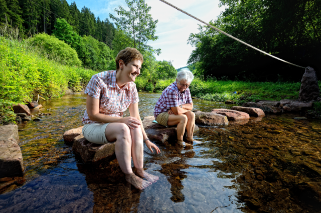 Das Teinachtal begleitet uns noch eine geraume Zeit bis wir über naturbelassene Trittsteine den Bach überqueren. Eine große Wiese lädt auch hier wieder zum Verweilen ein, während wir fröhlich in der Teinach die Füße abkühlen.