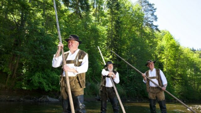 Gesteuert wird es von neun Männern der Flößerzunft, traditionell in weißen Hemden, Hirschlederhosen und schwarzen Filzhüten gekleidet. Gischt spritzt um ihre Stiefel, während sie geschickt auf den Tannenstämmen balancieren. Mit Muskelkraft und hölzernen Stangen manövrieren sie das Floß und surfen auf den Wellen der Nagold.