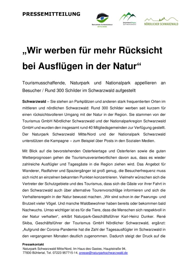 Natur und das führt stellenweise leider auch zu Problemen mit zurückgelassenem Müll oder nicht angeleinten Hunden in Schutzgebieten.“ Der Geschäftsführer der Nationalparkregion Schwarzwald, Patrick Schreib, stimmt zu: „Wir freuen uns, dass unsere Region immer beliebter wird und die Menschen sich nach mehr Natur sehnen. Wir wollen jedoch auch dafür werben, dass diese Ausflüge mit Respekt und Rücksicht auf die Natur gemacht werden.“