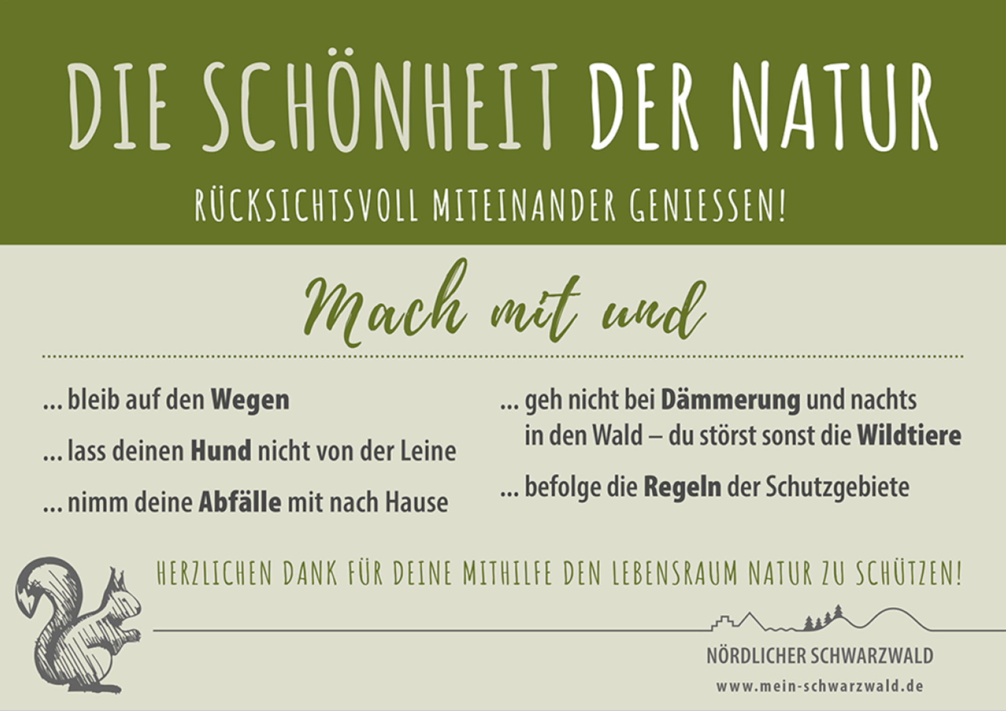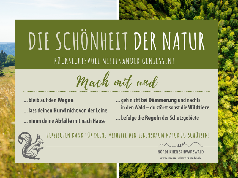Schwarzwald – Sie stehen an Parkplätzen und anderen stark frequentierten Orten im mittleren und nördlichen Schwarzwald: Rund 300 Schilder werben seit kurzem für einen rücksichtsvolleren Umgang mit der Natur in der Region. Sie stammen von der Tourismus GmbH Nördlicher Schwarzwald und der Nationalparkregion Schwarzwald GmbH und wurden den insgesamt rund 40 Mitgliedsgemeinden zur Verfügung gestellt. Der Naturpark Schwarzwald Mitte/Nord und der Nationalpark Schwarzwald unterstützen die Kampagne – zum Beispiel über Posts in den Sozialen Medien.