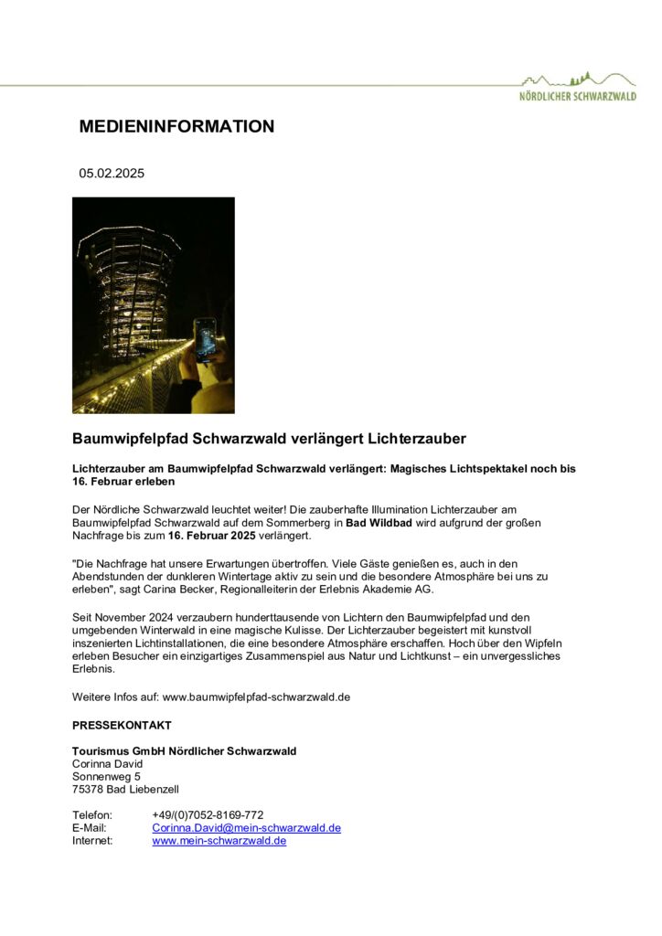 Der Nördliche Schwarzwald leuchtet weiter! Die zauberhafte Illumination Lichterzauber am Baumwipfelpfad Schwarzwald auf dem Sommerberg in Bad Wildbad wird aufgrund der großen Nachfrage bis zum 16. Februar 2025 verlängert.