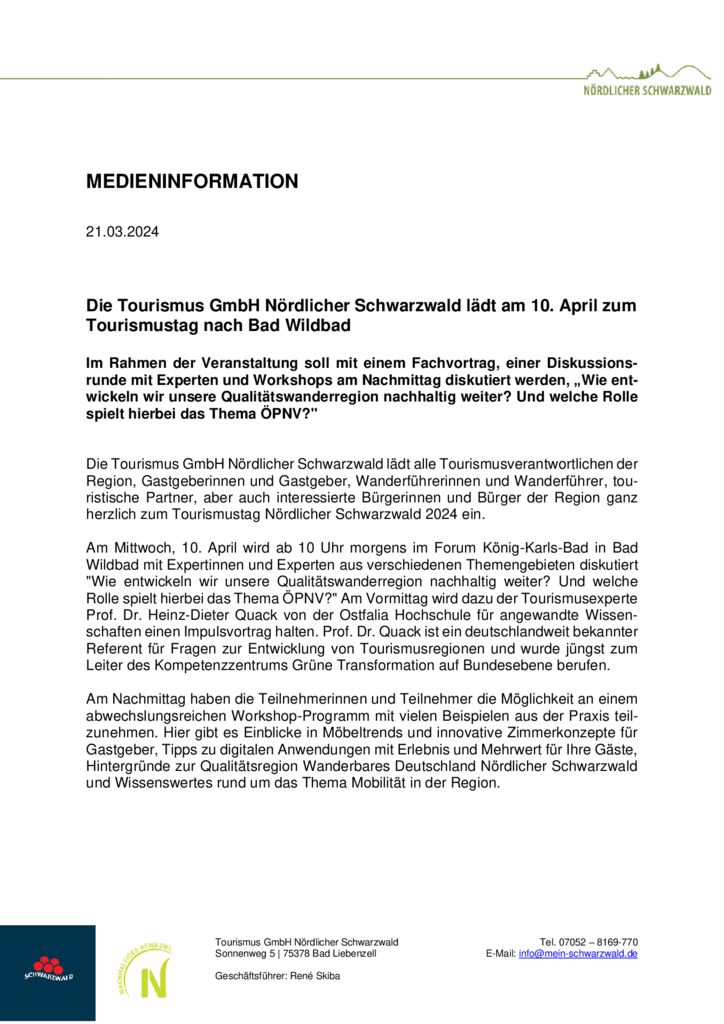 Weitere Informationen zum Tourismustag Nördlicher Schwarzwald 2024 und die Möglichkeit zur Anmeldung gibt es im Partner-Net der Tourismus GmbH Nördlicher Schwarzwald auf mein-schwarzwald.de (https://www.mein-schwarzwald.de/service/partner-net/) oder direkt über info@mein-schwarzwald.de | Telefon: 07052 8169-770.