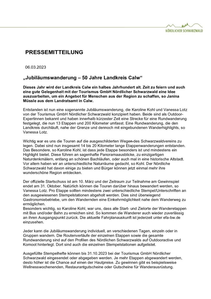 Dieses Jahr wird der Landkreis Calw ein halbes Jahrhundert alt. Zeit zu feiern und auch eine gute Gelegenheit mit der Tourismus GmbH Nördlicher Schwarzwald eine Idee auszuarbeiten, um ein Angebot für Menschen aus der Region zu schaffen, so Janina Müssle aus dem Landratsamt in Calw.