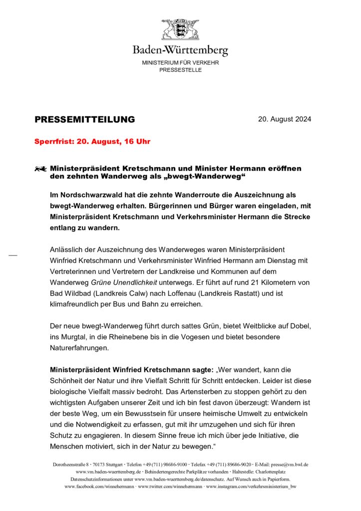 Verkehrsminister Hermann sagte: „Das Besondere an den bwegt-Wanderwegen ist, dass Start- und Endpunkt gut mit Bus und Bahn zu erreichen sind. Die Wanderinnen und Wanderer müssen auch nicht wie bei Rundwanderwegen zum Ausgangspunkt zurückkehren, wo das Auto geparkt ist. Stattdessen geht es auf den Streckenwanderwegen von Ort zu Ort durch abwechslungsreiche Landschaften. Wandern und ÖPNV passen zusammen. Ich freue mich, dass wir heute gemeinsam mit Ministerpräsident Kretschmann und allen Wanderfreundinnen und Wanderfreunden aus den Landkreisen die zehnte bwegt-Wanderroute Grüne Unendlichkeit auszeichnen.“
