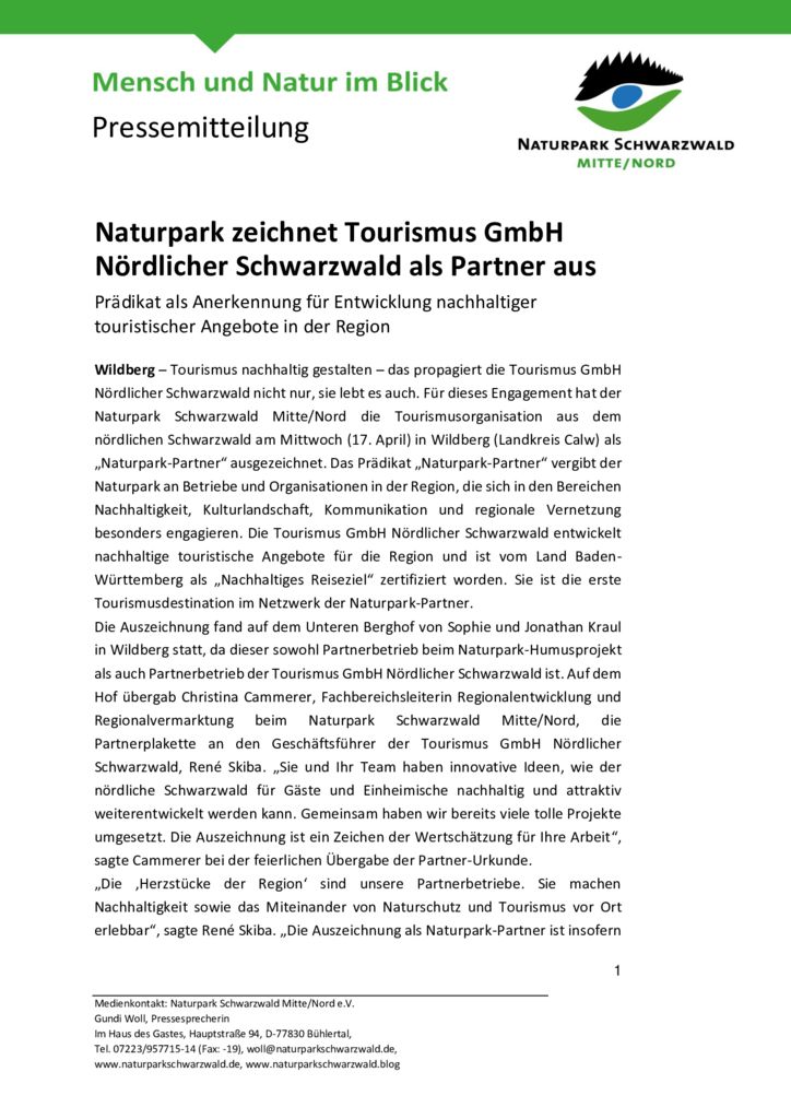 Tourismus nachhaltig gestalten – das propagiert die Tourismus GmbH Nördlicher Schwarzwald nicht nur, sie lebt es auch. Für dieses Engagement hat der Naturpark Schwarzwald Mitte/Nord die Tourismusorganisation aus dem nördlichen Schwarzwald am Mittwoch (17. April) in Wildberg (Landkreis Calw) als „Naturpark-Partner“ ausgezeichnet. Das Prädikat „Naturpark-Partner“ vergibt der Naturpark an Betriebe und Organisationen in der Region, die sich in den Bereichen Nachhaltigkeit, Kulturlandschaft, Kommunikation und regionale Vernetzung besonders engagieren. Die Tourismus GmbH Nördlicher Schwarzwald entwickelt nachhaltige touristische Angebote für die Region und ist vom Land Baden-Württemberg als „Nachhaltiges Reiseziel“ zertifiziert worden. Sie ist die erste Tourismusdestination im Netzwerk der Naturpark-Partner.