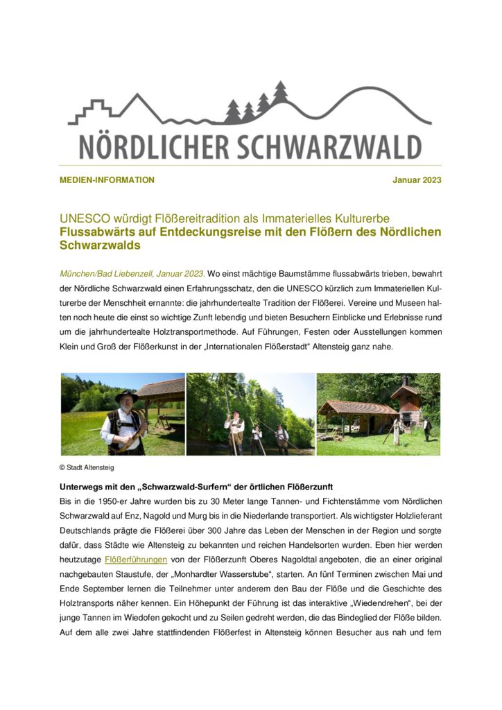 Wo einst mächtige Baumstämme flussabwärts trieben, bewahrt der Nördliche Schwarzwald einen Erfahrungsschatz, den die UNESCO kürzlich zum Immateriellen Kulturerbe der Menschheit ernannte: die jahrhundertealte Tradition der Flößerei. Vereine und Museen halten noch heute die einst so wichtige Zunft lebendig und bieten Besuchern Einblicke und Erlebnisse rund um die jahrhundertealte Holztransportmethode. Auf Führungen, Festen oder Ausstellungen kommen Klein und Groß der Flößerkunst in der „Internationalen Flößerstadt“ Altensteig ganz nahe.