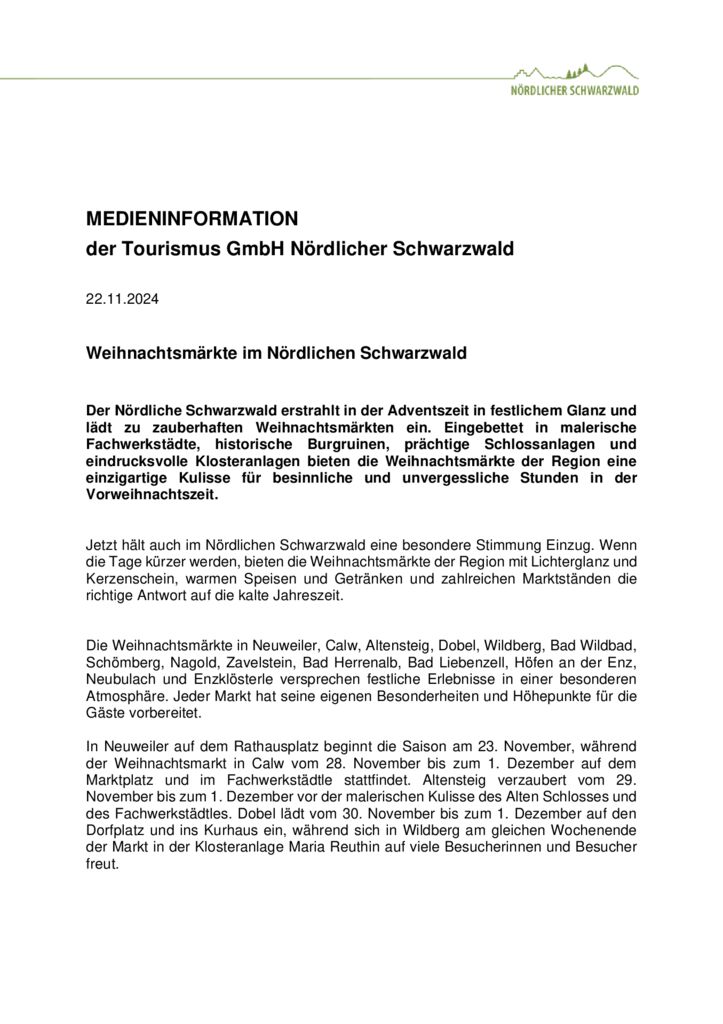 Für die Gäste und Bürgerinnen und Bürger der Region gibt es einiges zu entdecken und zu erleben. Um sicherzustellen, dass niemand etwas verpasst, gibt es eine Übersicht zu den Weihnachtsmärkten, auch in den Ortsteilen der einzelnen Städte und Gemeinden, im Nördlichen Schwarzwald unter www.mein-schwarzwald.de/weihnachtsmaerkte-im-noerdlichen-schwarzwald. Hier finden sich zu den einzelnen Weihnachtsmärkten alle wichtigen Informationen rund um die Öffnungszeiten, das Rahmenprogramm, den Angeboten für Kinder und Anreisemöglichkeiten mit dem ÖPNV, sowie weitere nützliche Hinweise.