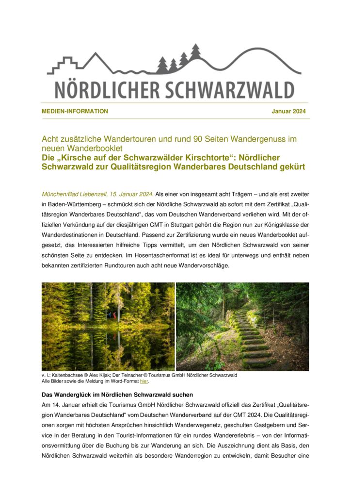 Am 14. Januar erhielt die Tourismus GmbH Nördlicher Schwarzwald offiziell das Zertifikat „Qualitätsregion Wanderbares Deutschland“ vom Deutschen Wanderverband auf der CMT 2024. Die Qualitätsregionen sorgen mit höchsten Ansprüchen hinsichtlich Wanderwegenetz, geschulten Gastgebern und Service in der Beratung in den Tourist-Informationen für ein rundes Wandererlebnis – von der Informationsvermittlung über die Buchung bis zur Wanderung an sich. Die Auszeichnung dient als Basis, den Nördlichen Schwarzwald weiterhin als besondere Wanderregion zu entwickeln, damit Besucher eine einzigartige Wanderauszeit genießen können. Laut Vanessa Lotz-Kijak, Projektleitung „Qualitätsregion Wanderbares Deutschland“ für den Nördlichen Schwarzwald, ist die Anerkennung „die Kirsche auf der Schwarzwälder Kirschtorte“. Von Genießerpfaden über geführte Wanderungen und Themenwegen bis hin zu mehrtägigen Wandererlebnissen durch die Region gibt es Interessantes zur Flora und Fauna zu entdecken. Einige dieser Wanderwege erfüllen zudem besondere Anforderungen und tragen die Bezeichnung Qualitätsweg oder Premiumweg – diese sind erkennbar an einem zusätzlichen Wegelogo. Ein Großteil der beliebten Touren ist außerdem einfach mit Bus und Bahn zu erreichen.