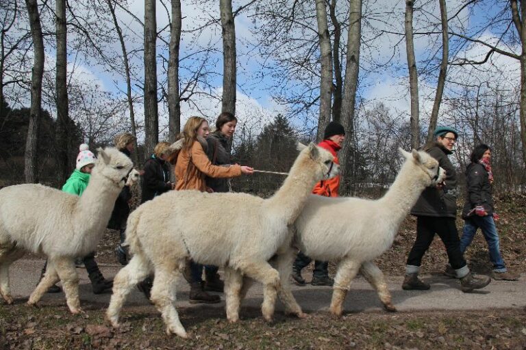 Das Wandern mit den kuscheligen Begleitern ist einfach ein ganz besonderes Erlebnis! Da die Alpakas von Natur aus neugierig sind und gerne etwas trödeln, kann es sein, dass ein Spaziergang von einer Stunde auch mal etwas mehr Zeit in Anspruch nimmt, aber genau das trägt schließlich zur Entspannung bei oder nicht?