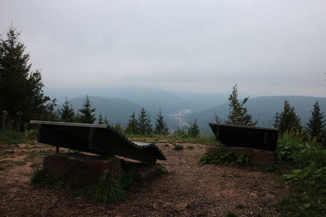Wenige Meter vor der Hütte warten zwei Liegebänke darauf, den ersten richtigen Ausblick auf das Ziel, Bad Herrenalb, zu genießen. Zwei geschnitzte Wildschweine leisten mir Gesellschaft. An der Schweizerkopfhütte angekommen, nutzen bereits einige andere Wanderer den Platz, um zu vespern oder sich auszuruhen. Die Aussicht ist grandios.